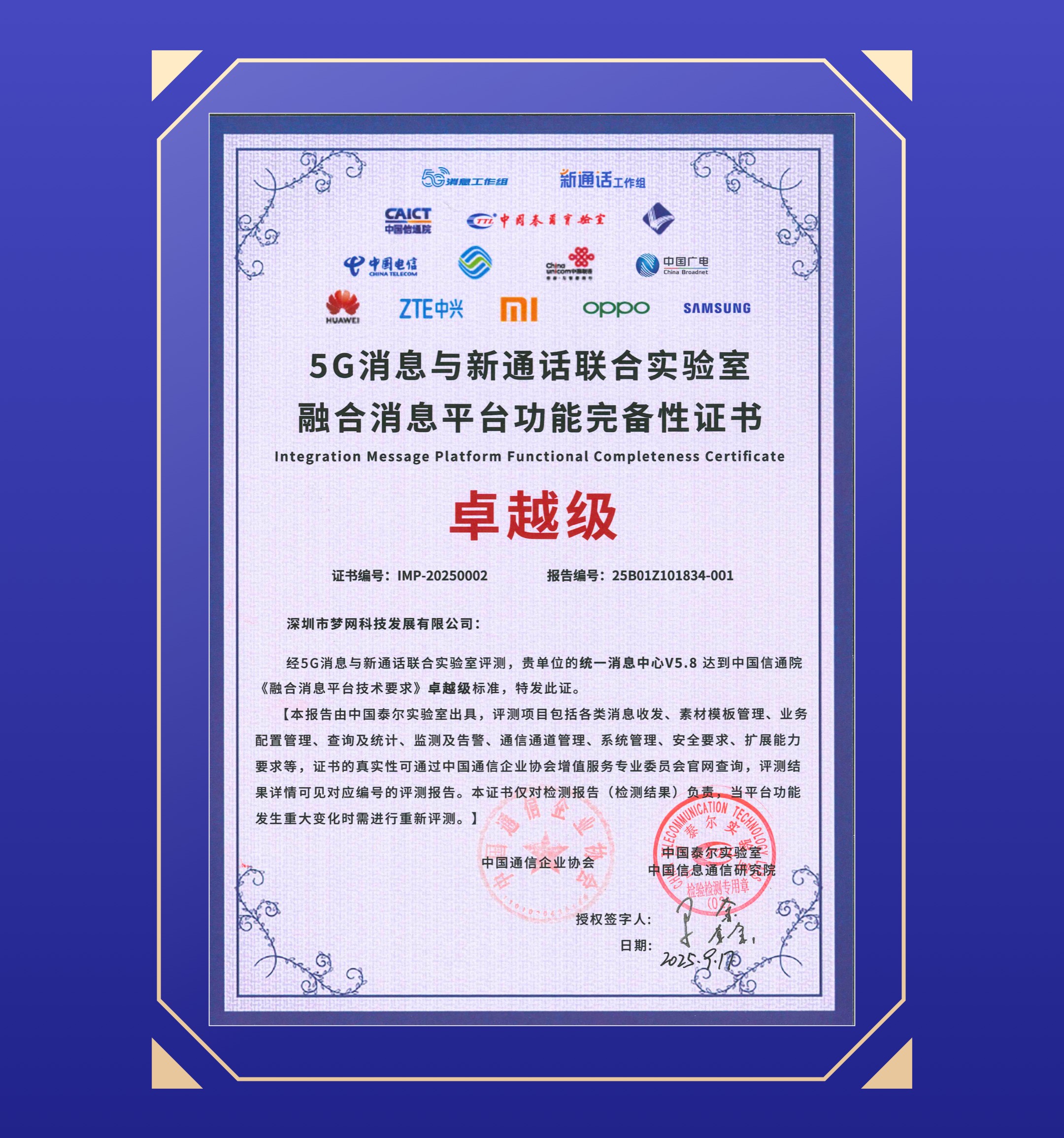 近日,夢(mèng)網(wǎng)科技統(tǒng)一消息中心(UMC)V5.8版本經(jīng)5G消息與新通話聯(lián)合實(shí)驗(yàn)室評(píng)測(cè),達(dá)到中國(guó)信通院《融合消息平臺(tái)技術(shù)要求》卓越級(jí)標(biāo)準(zhǔn)。這一權(quán)威認(rèn)證充分彰顯了夢(mèng)網(wǎng)科技在技術(shù)領(lǐng)域的深厚實(shí)力。