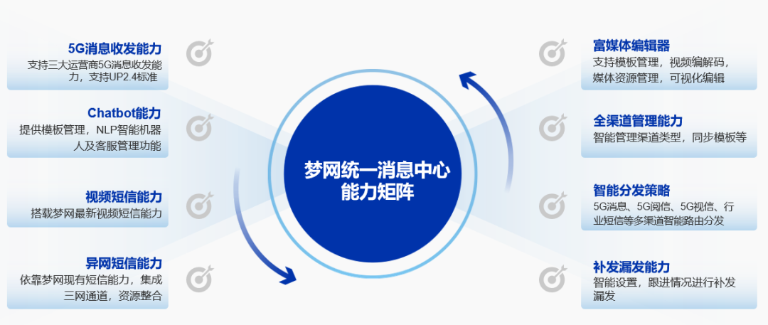 夢(mèng)網(wǎng)統(tǒng)一消息中心(UMC)作為面向5G時(shí)代打造的融合通訊解決方案,集智能接入、智能管理、智能生產(chǎn)、智能運(yùn)營(yíng)和智能營(yíng)銷于一體,實(shí)現(xiàn)了全終端、全場(chǎng)景、全業(yè)務(wù)、全渠道的廣泛覆蓋。UMC提供靈活的在線SaaS服務(wù)和定制化的線下私有化部署方案,能夠滿足不同行業(yè)的多樣化需求,并全面對(duì)接市面上主流的5G閱信渠道,包括夢(mèng)網(wǎng)閱信直發(fā)、天慧5G閱信、移動(dòng)5G閱信、聯(lián)通電信5G消息以及華為云KooMessage等,為企業(yè)構(gòu)建起高效、穩(wěn)定的通訊生態(tài)系統(tǒng)。
