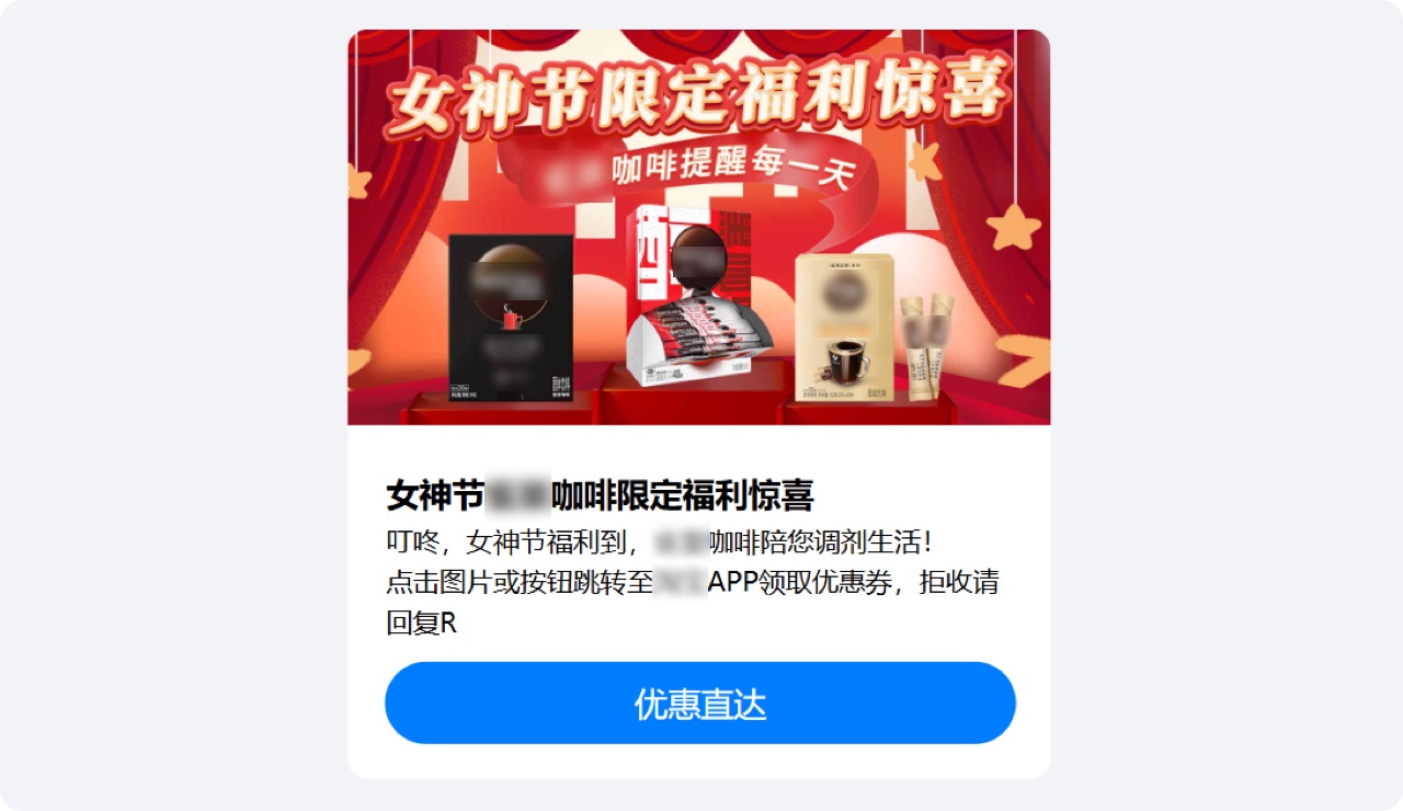 三八婦女節(jié)將至,品牌營銷熱度漸濃。王女士的手機短信箱里收到一條特別的消息,點開后不是枯燥的文字,而是一張精美的節(jié)日卡片。品牌slogan上方寫著“女神節(jié)限定福利驚喜”,下方是商品展示,加以介紹文案和醒目的“優(yōu)惠直達”按鈕。她順手一點,直接跳轉(zhuǎn)到購物APP,整個過程不到十秒。