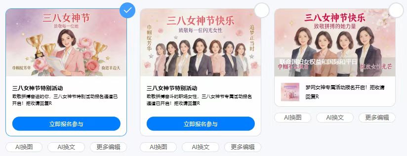 這一能力覆蓋圖文與視頻兩大方向。圖文類模板建模,無論是電商大促海報、節(jié)日紅包還是服務(wù)通知卡片,輸入業(yè)務(wù)需求,便能自動匹配視覺風格、生成文案,分鐘級產(chǎn)出多款視覺方案,并自動規(guī)避行業(yè)合規(guī)雷區(qū),讓設(shè)計師專注核心創(chuàng)意,徹底告別反復(fù)改稿。